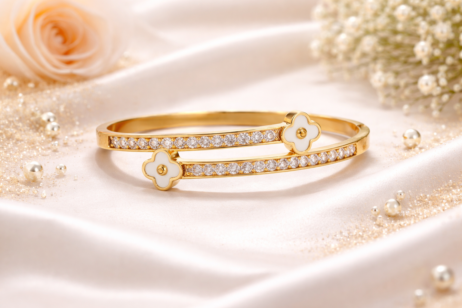 This graceful bracelet features a sleek double-row gold band, fully lined with sparkling white stones for a luminous, modern look. Two enamel flower motifs sit delicately on top, adding a soft feminine charm that makes this piece perfect for both festive occasions and elevated everyday wear.