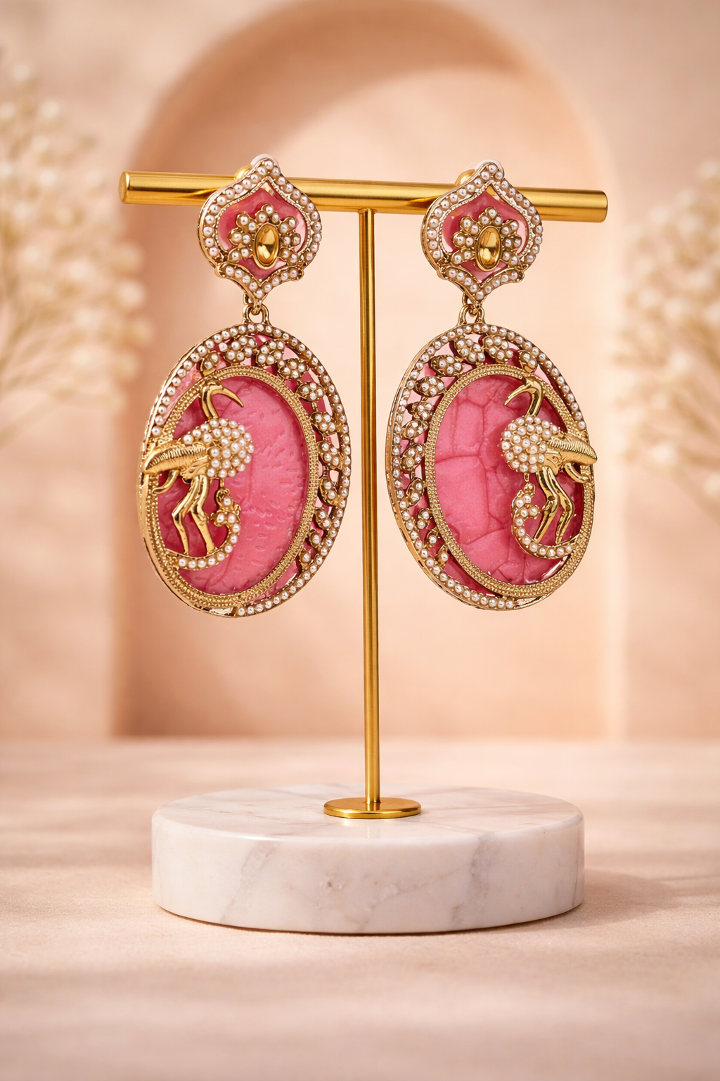 Pink Coral Peacock Gold Drop Earrings – Ethnic Wedding Chandbali Earrings