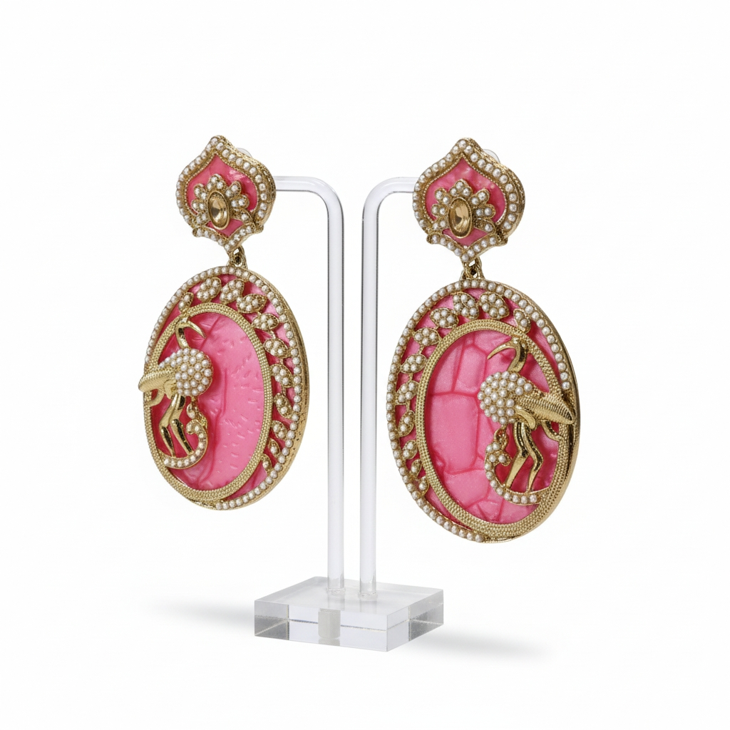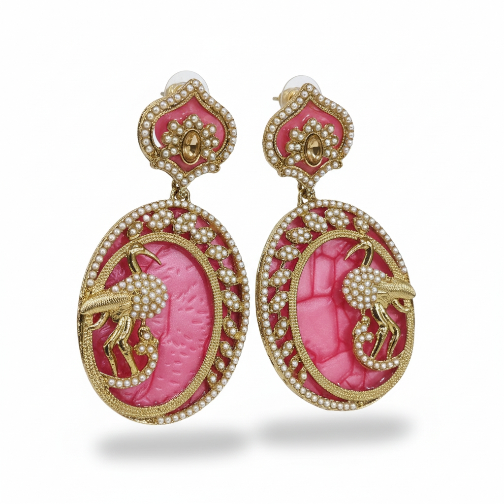 Stunning pink coral peacock motif gold drop earrings with pearl accents. Perfect for weddings, festivals, Diwali and Indian ethnic wear like sarees lehengas.