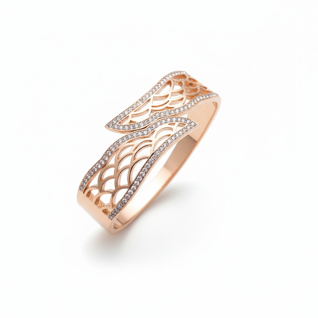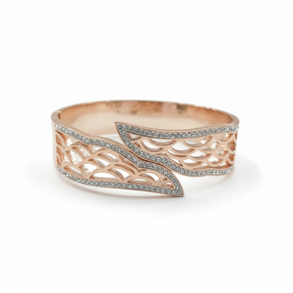 Infuse your jewelry collection with effortless fluid motion with our Rose Gold Filigree Wave Bangle. This striking statement piece features an intricate, openwork “scallop” or “wave” pattern that mimics the organic beauty of the sea. Crafted in a warm, romantic rose gold finish, the edges of the bypass-style band are meticulously lined with brilliant pavé-set crystals, creating a shimmering halo effect that illuminates the wrist.